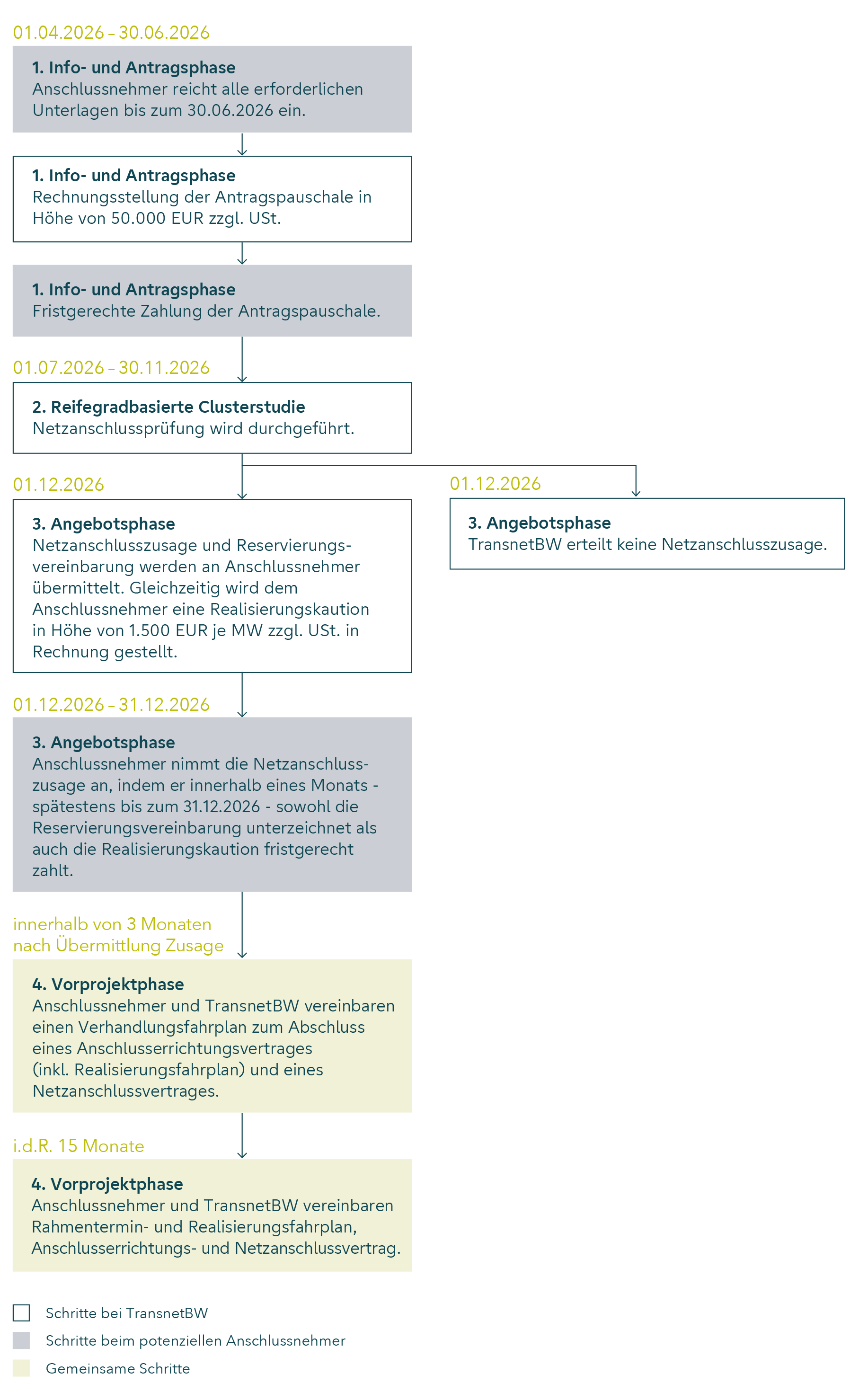 Die vier Übertragungsnetzbetreiber (ÜNB) 50Hertz, Amprion, TenneT Germany und TransnetBW haben ein neues Verfahren für die Bereitstellung von Netzanschlüssen für bestimmte Anlagenarten eingeführt. Anschlussanträge von Großbatteriespeichern, Rechenzentren, Elektrolyseuren und anderen Großverbrauchern an das Übertragungsnetz werden künftig anhand einer Reihe nachprüfbarer Kriterien und ihrer Realisierungswahrscheinlichkeit bewertet. Die ausführliche Beschreibung des Reifegradverfahrens sowie weitere übergreifende Informationen finden Sie auf www.netztransparenz.de.